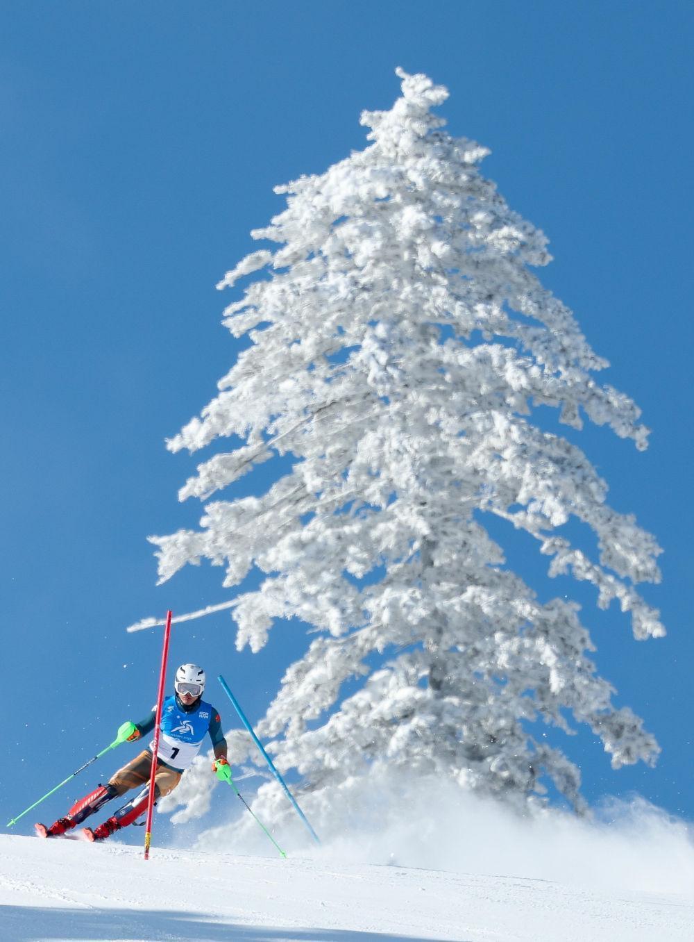 ↑2025年2月9日,中国选手刘校辰在第九届亚冬会高山滑雪男子回转比赛中。