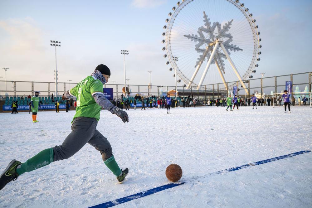 ↑2025年12月20日,参赛球员们在哈尔滨市“冰超”系列冰雪赛事启动仪式暨“冰雪大世界杯”2025-2026年冰城首届“冰雪绿茵”大众雪地足球挑战赛中。