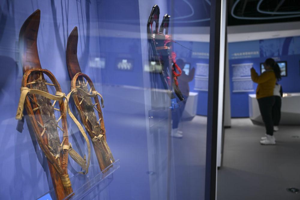 ↑2025年1月24日,游客在位于新疆将军山国际滑雪度假区的阿勒泰人类滑雪起源地博物馆参观。