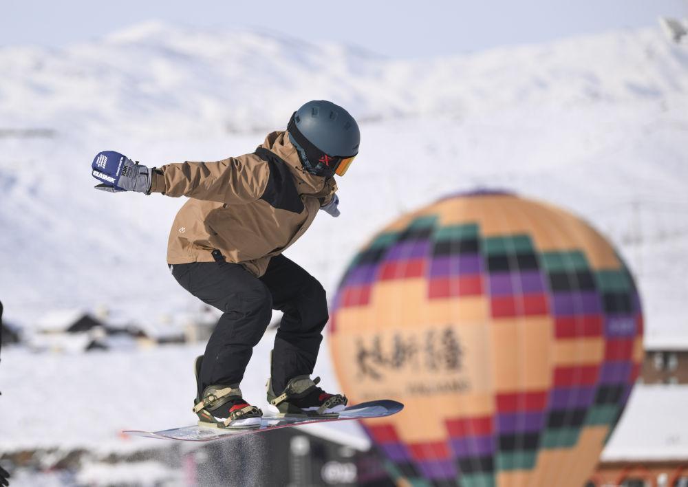 ↑2025年11月29日,中国选手葛春宇在国际雪联大跳台世界杯云顶站单板滑雪男子组决赛中完成第二跳后向观众致意。