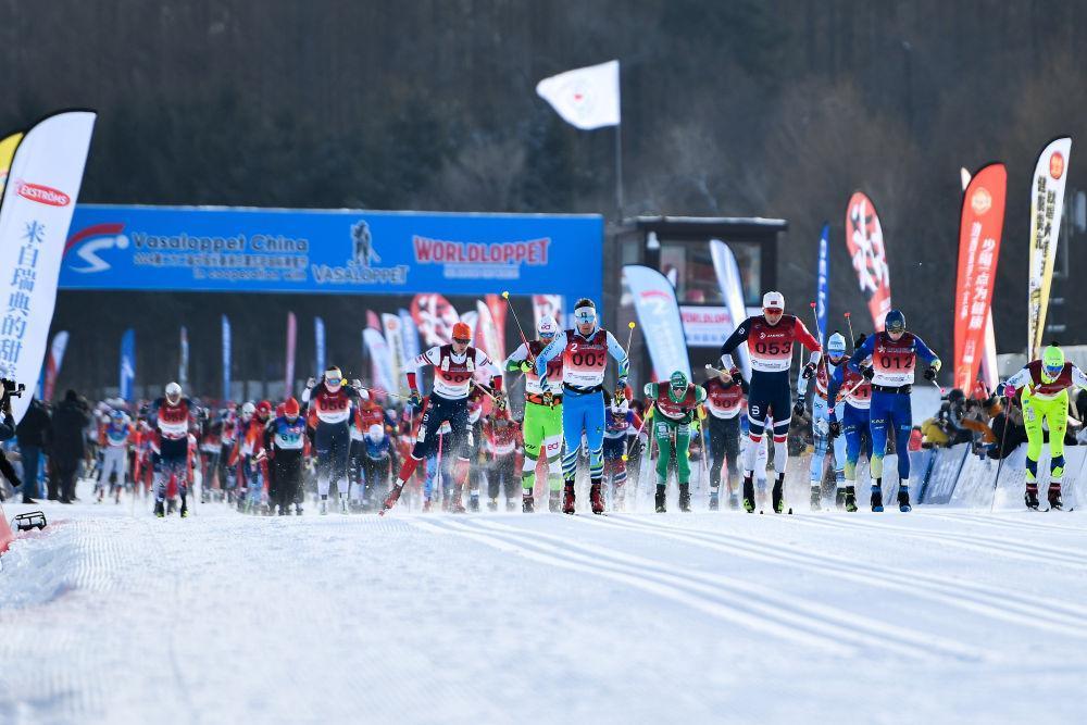 ↑2024年1月4日,参赛选手在第22届中国长春净月潭瓦萨国际滑雪节比赛中出发。