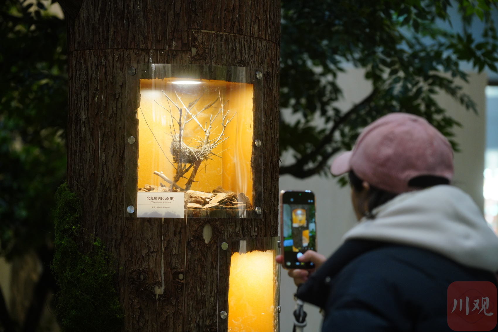 展厅内人气十足,青头潜鸭、东方白鹳等珍稀鸟类标本形态逼真,吸引摄影爱好者驻足记录。“城市绿岛”微缩模型还原真实栖息环境,观众漫步其间仿佛置身自然。“鸟喙打卡墙”前,亲子家庭沉浸式探索鸟类取食奥秘。此次展览集结200余件(套)标本、百余幅摄影作品与多媒体展项,以科学与艺术融合的手法,通过《鸟瞰古今》主题视频串联古蜀图腾与现代蓉城,更融入儿童友好理念、邀请中小学师生参与策展共创。