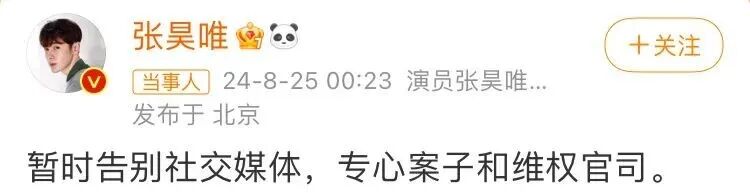 2024年8月25日,张昊唯在微博发布消息称,“暂时告别社交媒体,专心案子和维权官司。”