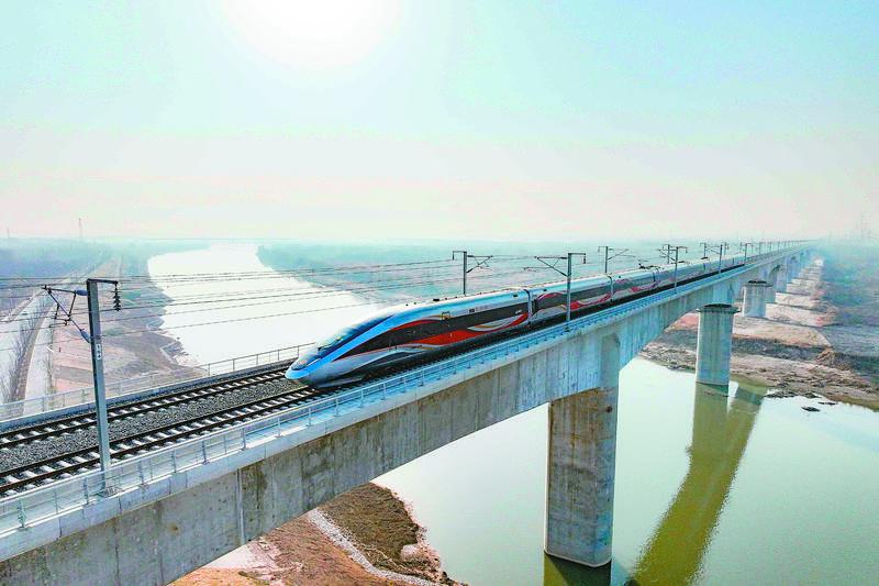 12月26日上午10时,随着C9309次“复兴号”智能动车组和C9312次“复兴号”智能动车组分别从延安站和西安北站双向发车,西安至延安高铁正式开通运营,革命圣地延安迈入“高铁时代”。至此,我国高铁营业里程突破5万公里,稳居世界第一。图为首发列车通过西延高铁渭河特大桥。(西安报业全媒体首席记者 翟小雪 西安报业全媒体记者 郝钟毓 摄)