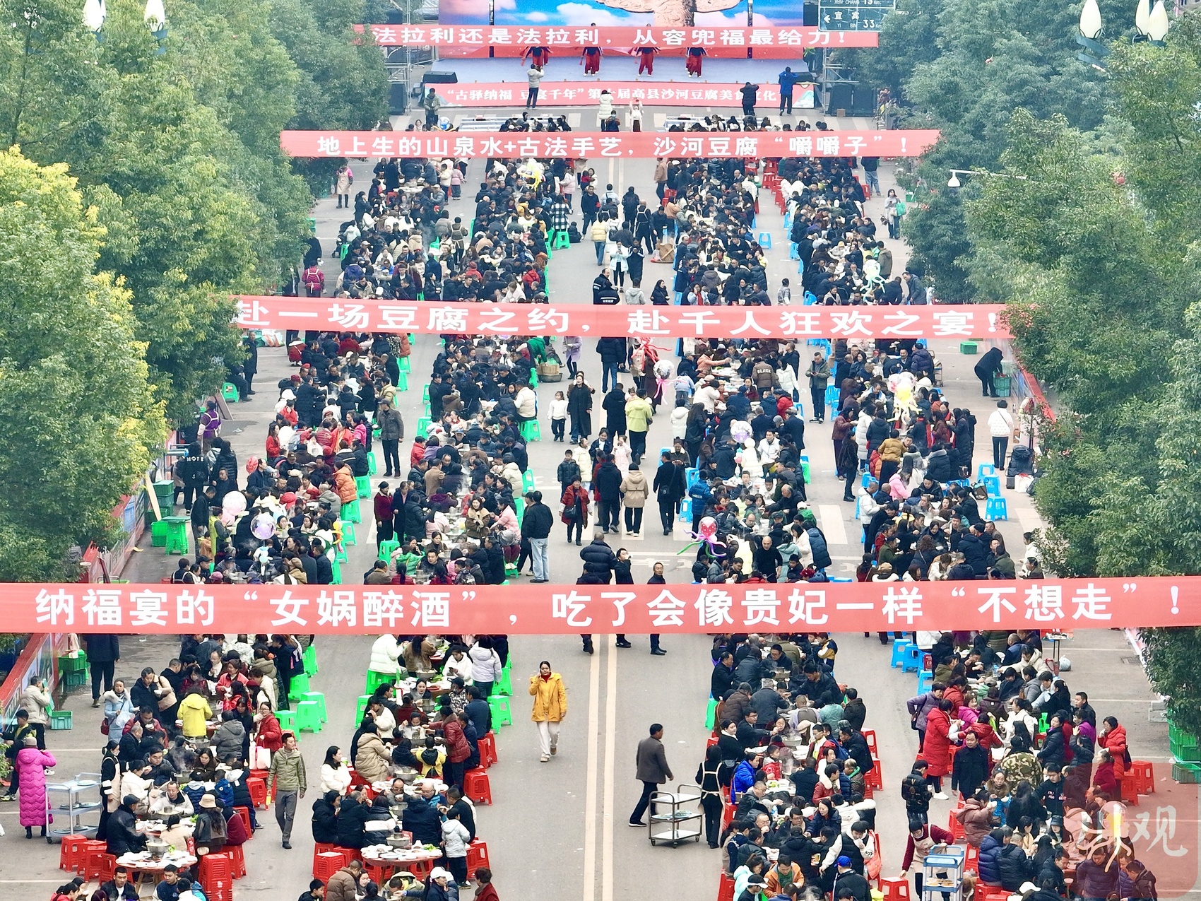 近200个土火锅,正在千年古驿街心沸腾。12月27日,第十届高县沙河豆腐美食文化节在宜宾高县沙河镇火热举行。近2000名食客齐聚古驿长街,共享“千人纳福宴”,通过融合非遗体验、美食市集等方式,展现传统新活力,带动当地文化与消费热潮。