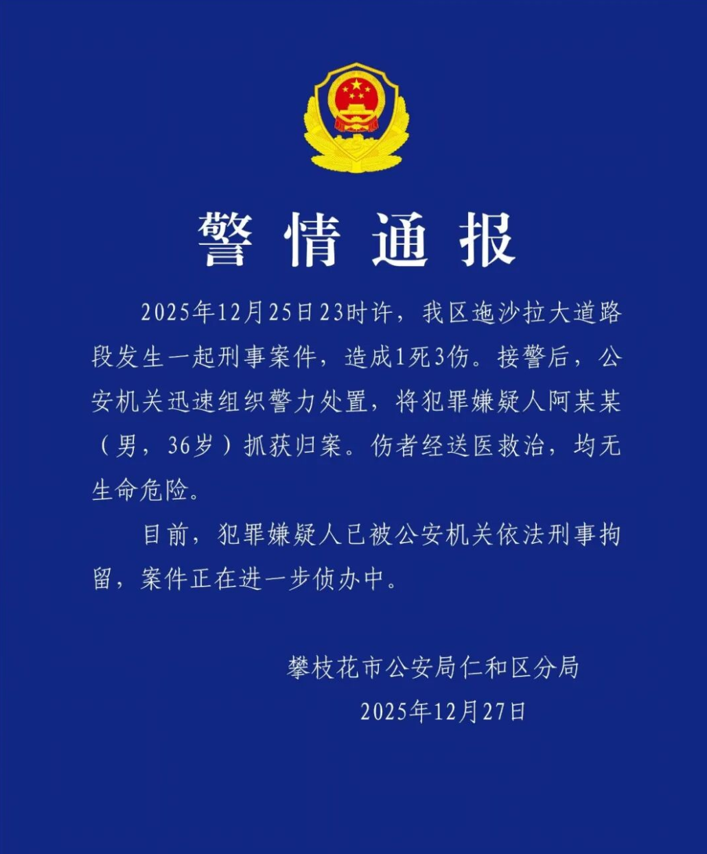 2025年12月25日晚上11点左右,四川攀枝花仁和区迤沙拉大道路段发生一起刑事案件,造成人员伤亡。12月27日,攀枝花市公安局仁和区分局就该案件发布警情通报如下:
