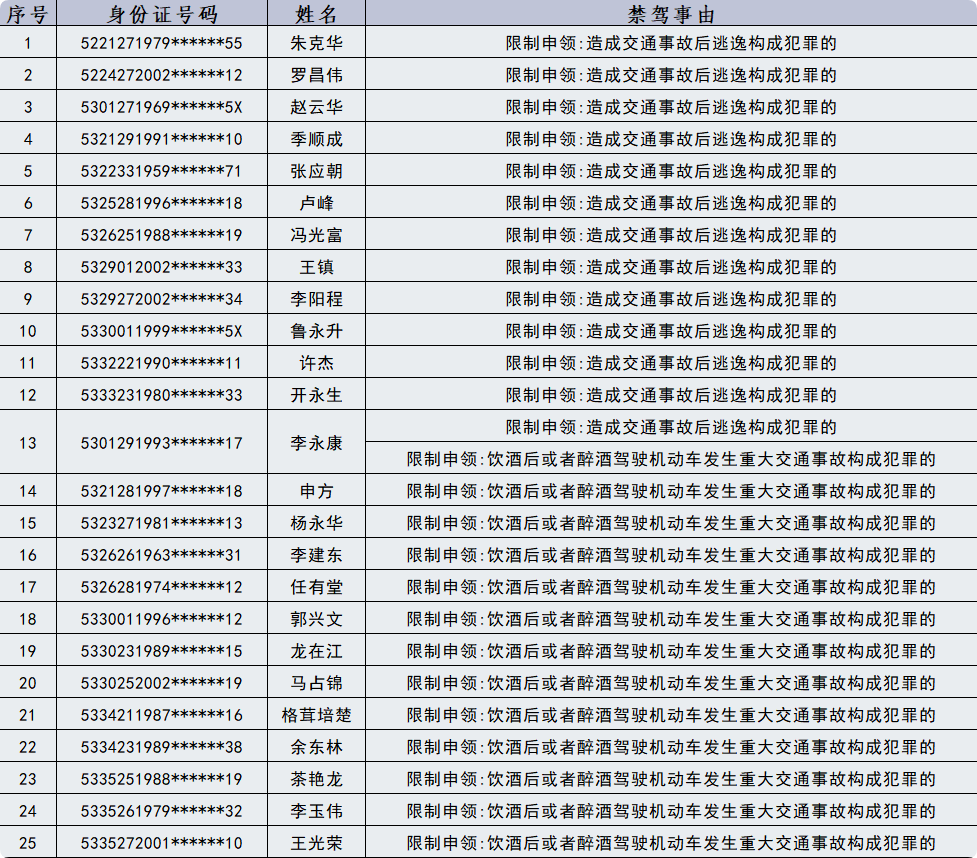 今年11月21日-12月20日,云南省共有25人受到终生禁驾处罚。云南交警对这批终生禁驾人员进行曝光,希望广大驾驶人引以为戒,深刻认识到酒后驾驶和肇事逃逸的严重后果,自觉增强交通安全意识、文明意识、法治意识,做文明守法的交通参与者。