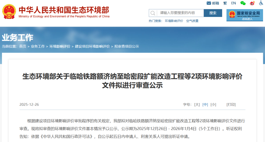 12月26日,生态环境部发布了《关于临哈铁路额济纳至哈密段扩能改造工程等2项环境影响评价文件拟进行审查公示》。临哈铁路额济纳至哈密段扩能改造工程环评文件即将进入审查和批复阶段,离正式开工又推进了一大步。根据公示:“项目包括正线及相关工程。正线起自阿拉善盟额济纳旗额济纳站,终点为哈密市伊州区哈密东站(不含)。额济纳站至梧桐水站段增建二线;梧桐水站至哈密东站段只进行单线电化改造。相关工程包括改建嘉策铁路联络线、梧桐水地区改建临哈线站后工程以及梧桐水站改建工程、哈密东站万吨分解场增设到发线及机务折返段改造、哈密货车检修车间扩建。总投资197.7亿元,其中环保投资约6.6亿元。建设工期2.5年。国铁集团、内蒙古自治区人民政府、甘肃省人民政府、新疆维吾尔自治区人民政府以国铁发改〔2025〕225号文件批复项目可研。”
