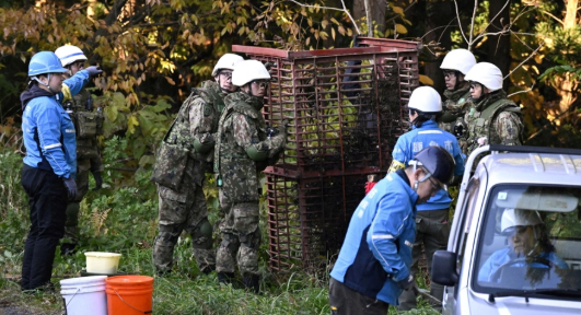 相关人员在秋田县设置用于捕熊的陷阱。 图据新华社