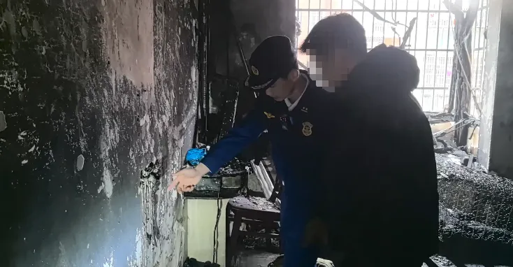 户主给消防员指出事发前头灯充电器的位置。图源:九江消防