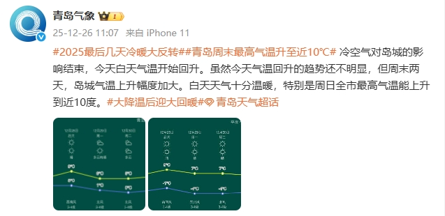据@青岛气象消息,周六白天,岛城是多云间晴的天气,气温将在今天的基础上继续回升,预计全市最高气温在5℃~6℃之间。需要注意的是,北部内陆地区早晚时段仍是寒意较重,今夜至明晨,内陆地区最低气温在-4℃~-3℃。周日天气晴朗,最高气温上升程度达近期鼎盛,全市最高气温能上升到8~10℃之间,天气温暖舒适,风力整体不大,适宜周末外出活动。