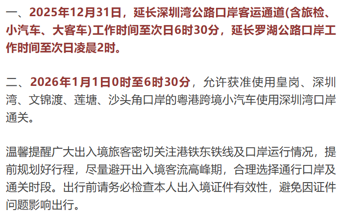 为保障跨境旅客在节假日期间便捷通关,现就跨年夜口岸通关时间调整作如下安排: