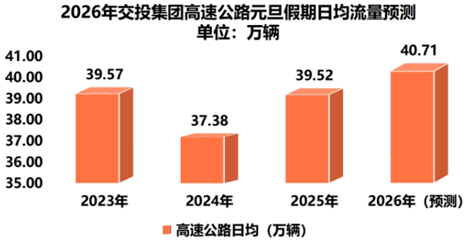 根据历年元旦假期路网交通量监测数据,结合当前出行需求特征等综合研判,预计2026年元旦假期,交投集团管辖高速公路日均交通量预计较去年小幅增长,其中小型客车占61.09%。