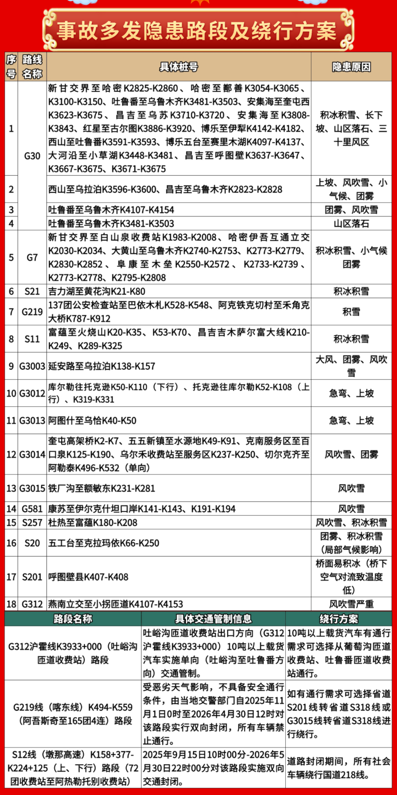 假期期间,易拥堵路段主要为G7线京新高速大黄山至乌鲁木齐段、G30线连霍高速乌鲁木齐至奎屯段、G30线连霍高速星星峡至吐鲁番段、G3012线吐和高速小草湖至和硕至库尔勒段、G3003线乌鲁木齐东绕城高速。