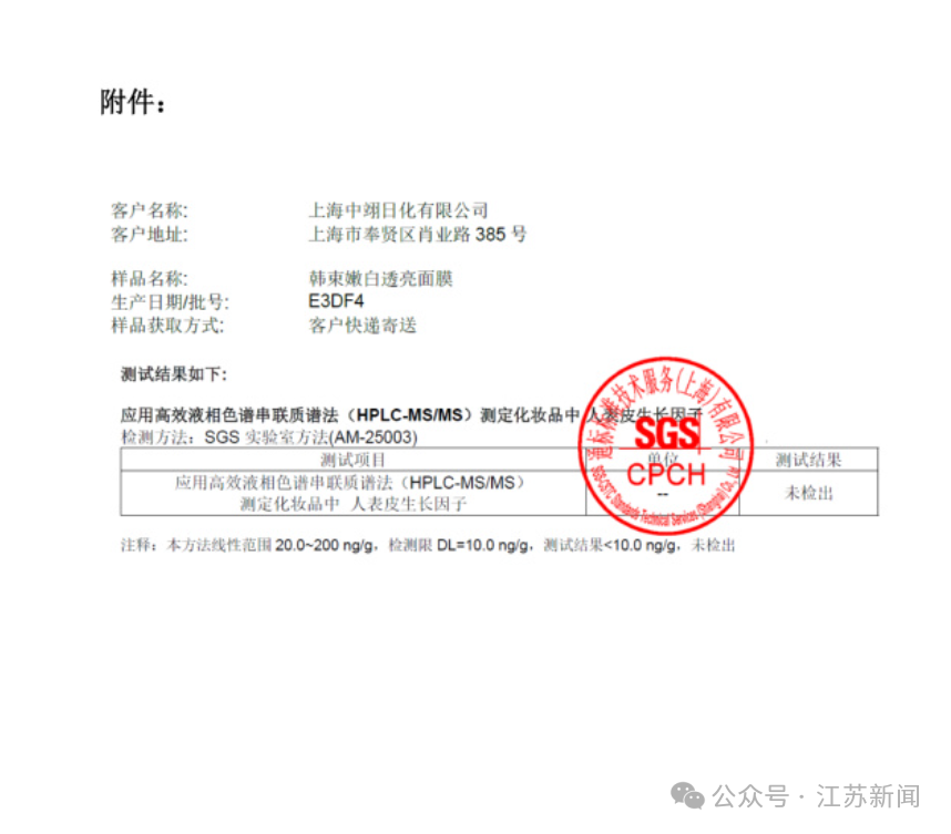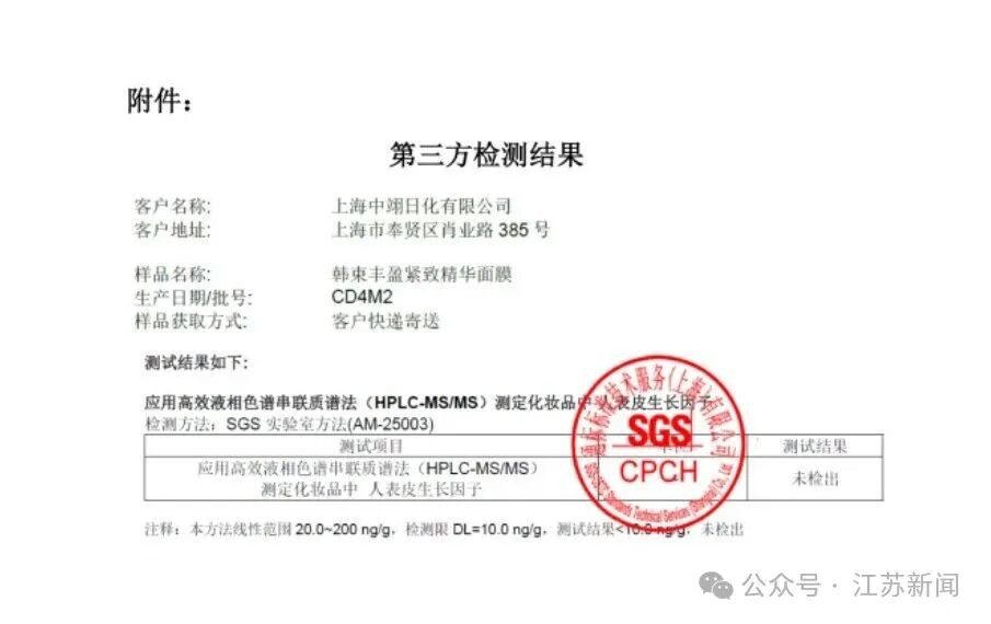 报道发生后,我们已立即启动全面自查与追溯程序。早在2025年11月,上海市药品监督管理局稽查局已就该产品开展了现场核验与检测,并基于客观公允性进行了双向送检,结果均显示:送检样品中均未添加人表皮生长因子(EGF)成分。第三方专业机构SGS的检测报告详见附件图片。