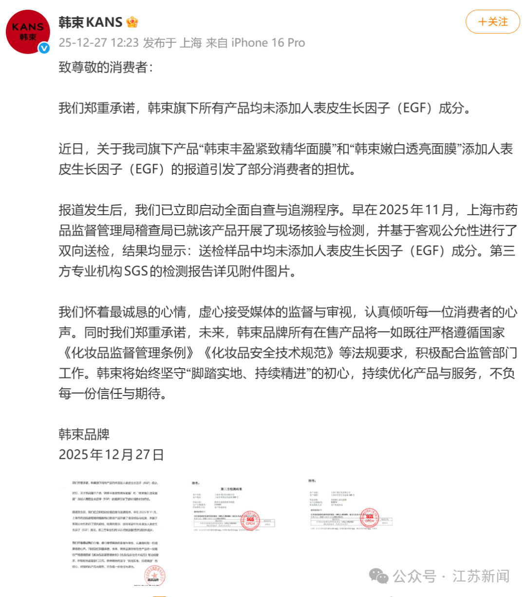 12月27日,@韩束KANS发文称:我们郑重承诺,韩束旗下所有产品均未添加人表皮生长因子(EGF)成分。
