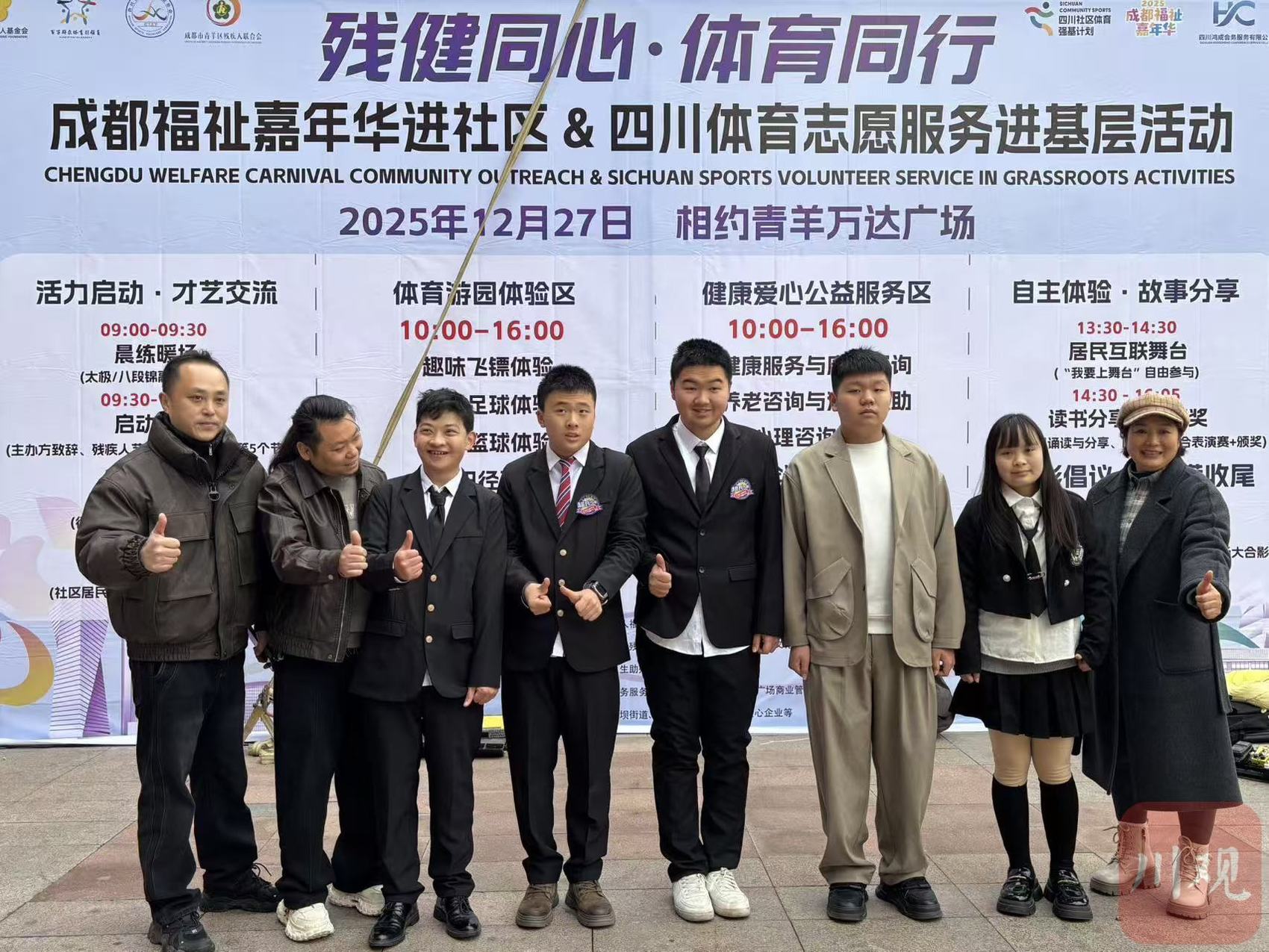 12月27日,成都青羊区万达广场,“残健同心·体育同行”福祉嘉年华活动正在举行。这场特殊的周末“聚会”吸引了社区居民走出家门,在趣味体育、才艺展演和互动交流中,共同绘出一幅残健融合、社区共融的温暖画卷。