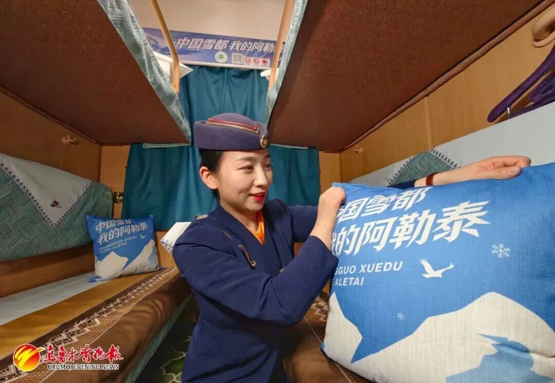 12月26日,在“中国雪都·我的阿勒泰”号快速旅客列车上,乘务员正在整理床铺。该旅客列车已完成设施设备、内外装饰等的全部更新,计划于12月31日首发。