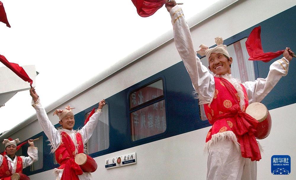 2005年7月1日,延安人以安塞腰鼓庆祝延安至北京西的T45次特快列车首发。T45/46是陕北革命老区第一对直通北京的特快旅客列车,行程16小时38分。新华社记者丁海涛 摄