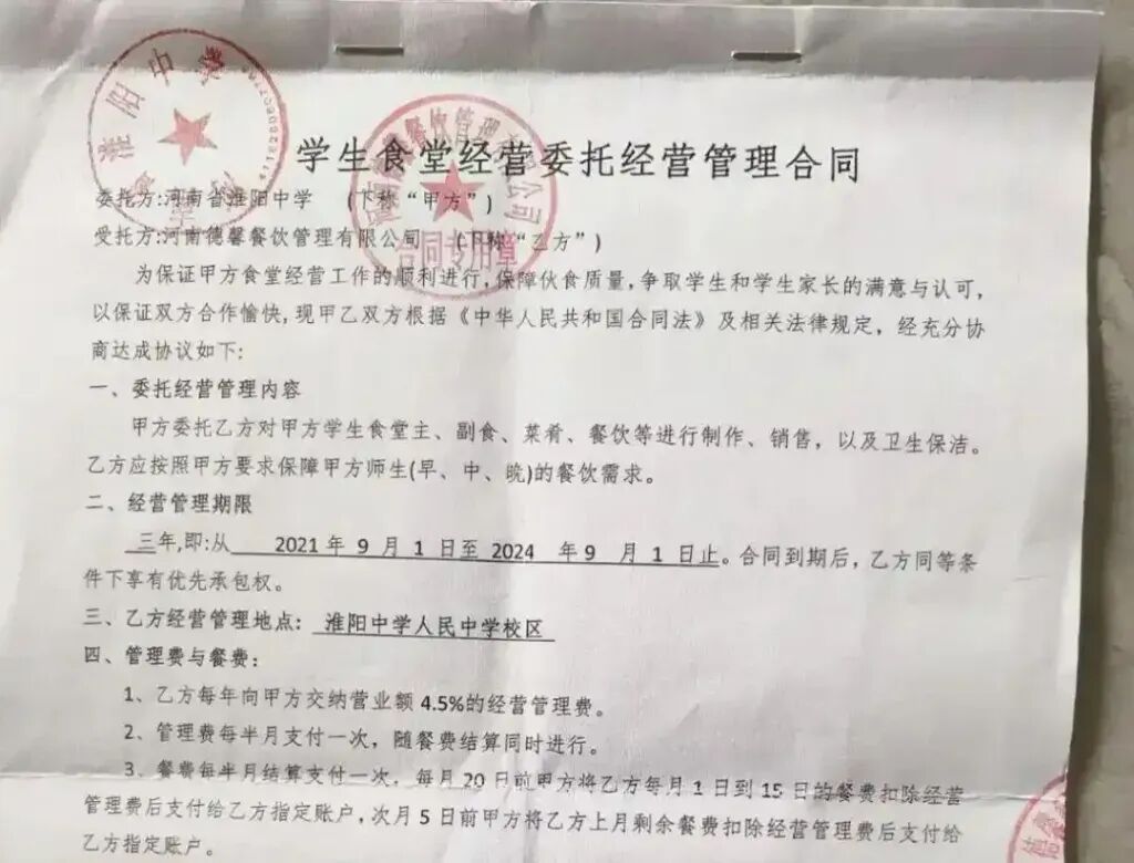 12月24日,河南德馨餐饮管理有限公司负责人马蕤实名向周口市淮阳区纪委举报,2022年9月至2024年7月,周口市淮阳人民中学(淮阳中学初中部)后勤负责人在校领导的指示下,以收取“管理费”为由,数次从学生缴纳的全部餐费中拿走15%的返点,共计330余万元。