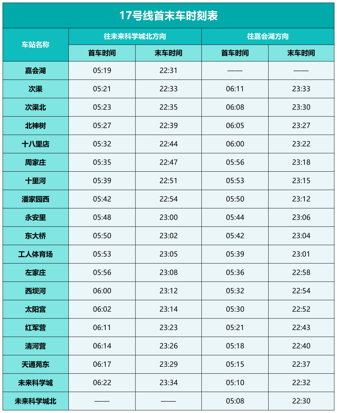 北京地铁6号线、17号线、18号线首末车最新时刻表