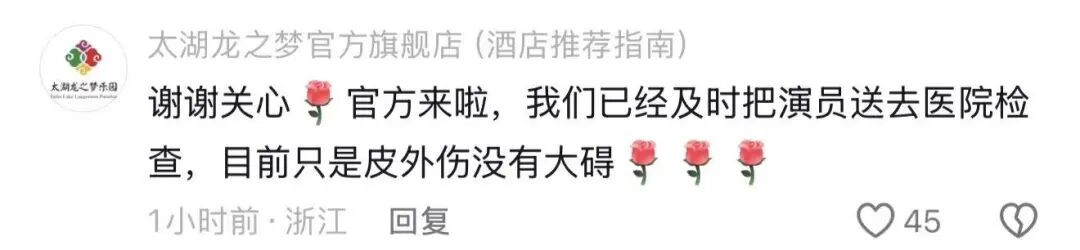 随后,长兴太湖龙之梦旅游营销管理有限公司在网上留言称:来报平安啦!当晚大马戏演出过程当中,演员不慎摔下落在防护软垫上,我们第一时间把演员送往医院进行检查,演员经过检查后为皮外伤,身体无大碍。目前已安排他休息了。