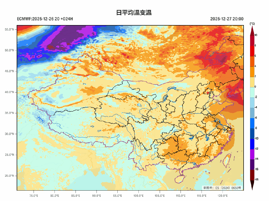 在冷空气影响抵达之前,东北偏暖程度最为显著:明天哈尔滨最高气温-2℃,长春0℃,沈阳5℃,都将较常年12月下旬平均水平偏高了8~10℃。但从下周开始迎来降温,到1月1日前后,东北多地过程累计降温幅度能达到10~20℃,在冷和极寒之间快速切换。