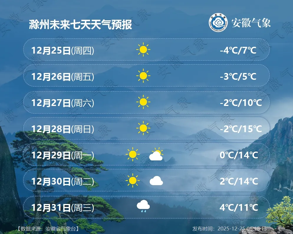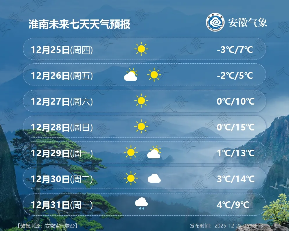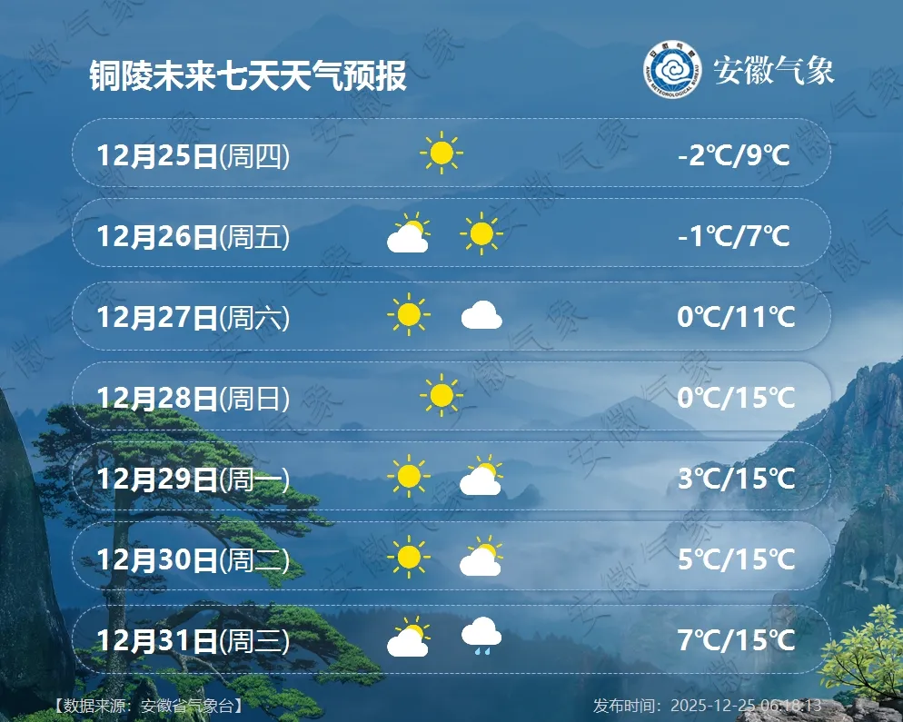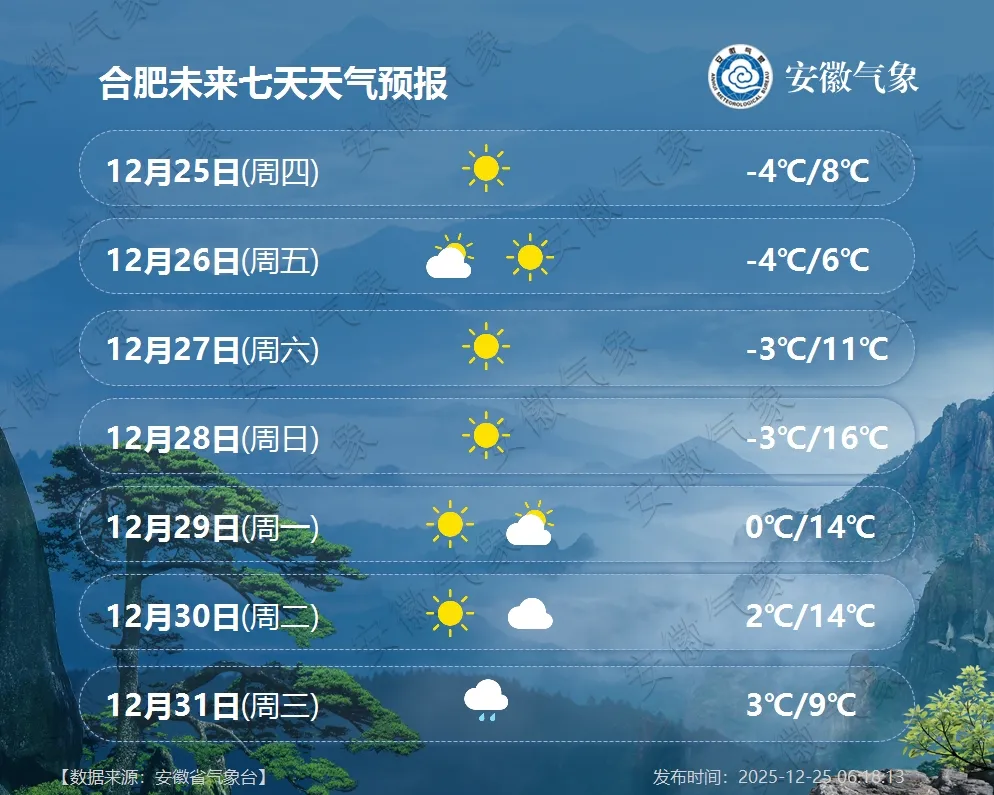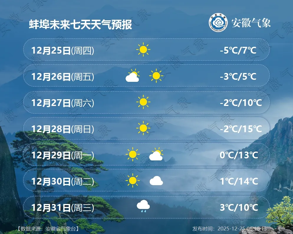 12月26日早晨,安徽沿淮淮北东部和本省山区最低气温低至-6~-4℃,沿江西部-2~0℃,其他地区-5~-3℃。28日前全省气温回升。28日夜里到29日有弱冷空气影响我省。