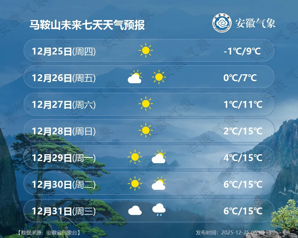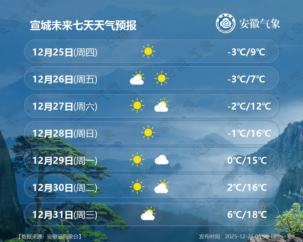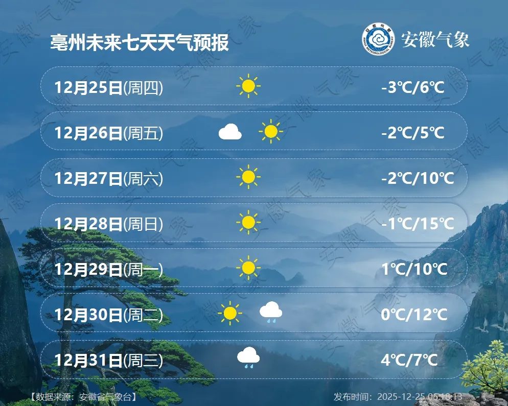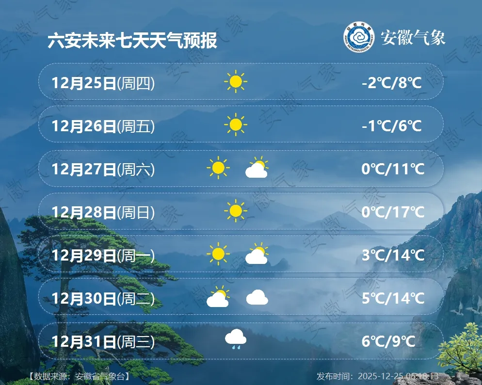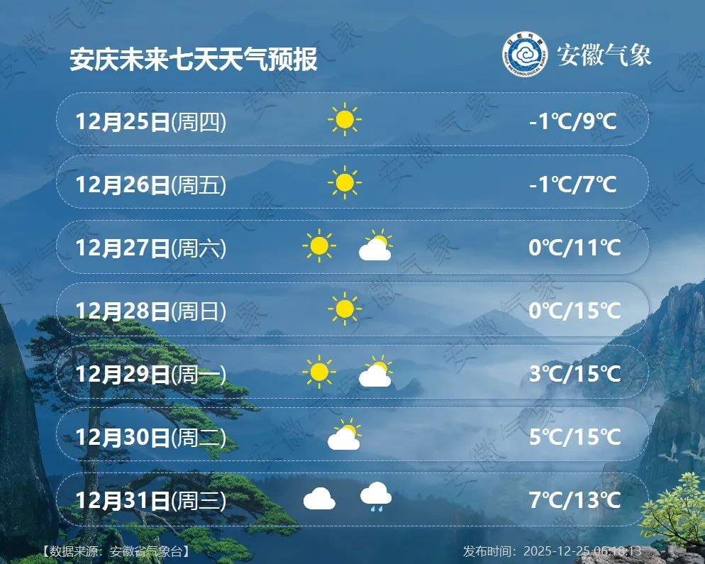 12月26日早晨,安徽沿淮淮北东部和本省山区最低气温低至-6~-4℃,沿江西部-2~0℃,其他地区-5~-3℃。28日前全省气温回升。28日夜里到29日有弱冷空气影响我省。