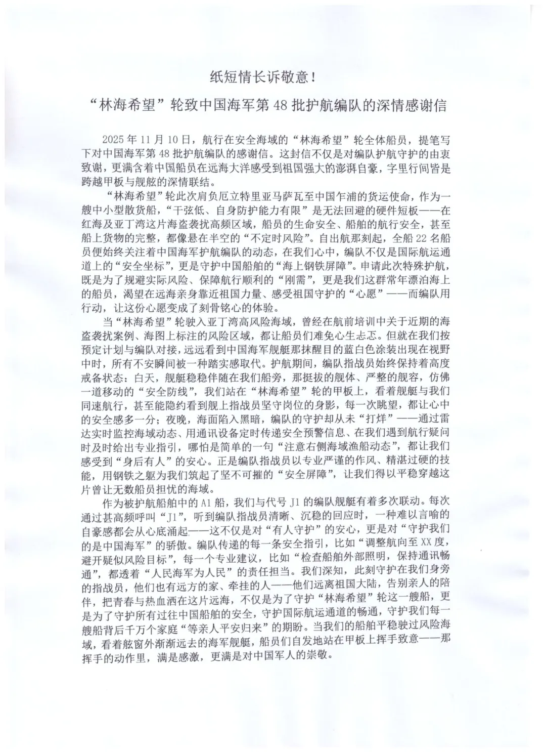 “这次护航经历,让我们对‘祖国强大’有了最真切、最鲜活的理解:它不是新闻里的数字,不是报告中的论述,而是当我们在异国海域遇到风险时,能第一时间找到的‘中国坐标’;是当我们需要守护时,能及时出现的‘中国力量’;是让我们在与外国船员交流时,能骄傲说出‘我们有中国海军护航’的底气……” 11月10日,“林海希望”轮,船长赵青和全体船员提笔写下这封感谢信。