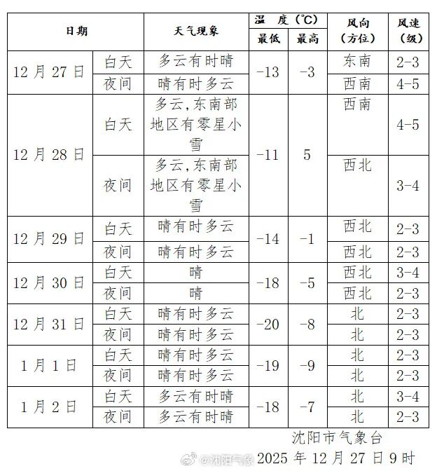 27日20时到28日16时,全省晴转多云;最低气温大连地区零下4℃到2℃,沈阳、抚顺、阜新、铁岭、朝阳地区和沈抚示范区零下15℃到零下10℃,其他地区零下9℃到零下5℃;全省最高气温3℃到8℃。