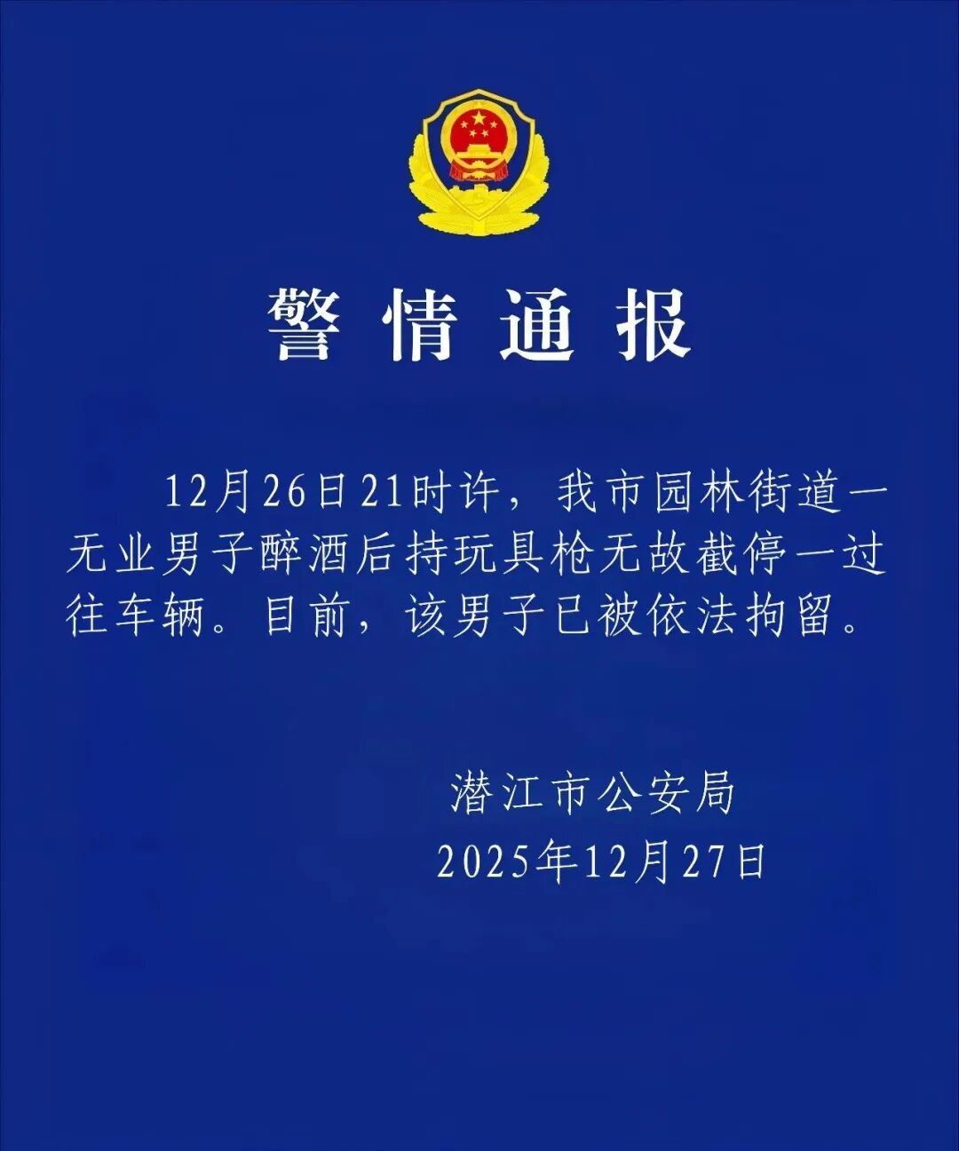 12月27日,潜江市公安局就此发布警情通报:12月26日21时许,我市园林街道一无业男子醉酒后持玩具枪无故截停一过往车辆。目前,该男子已被依法拘留。