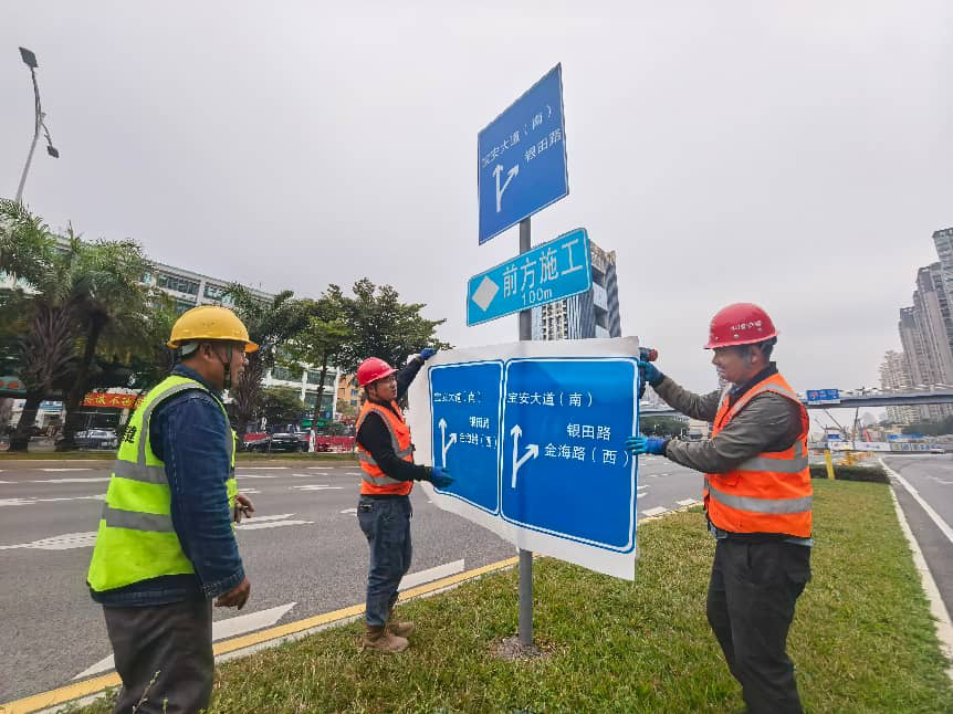 同时,银田创意园公交站附近的道路分叉口,施工人员正加紧更换交通标识;临近天桥上的分流指引标识已完成更新,清晰引导车辆通行方向。