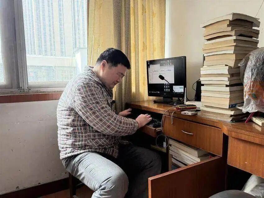 12月10日,武汉市武昌区武锅社区,盲人周顺在家中打开电脑,通过读屏软件找到QQ,将长达57万字的修订版《物理中的数学》(中册)书稿在线发送给了武汉大学出版社编辑何青霞。