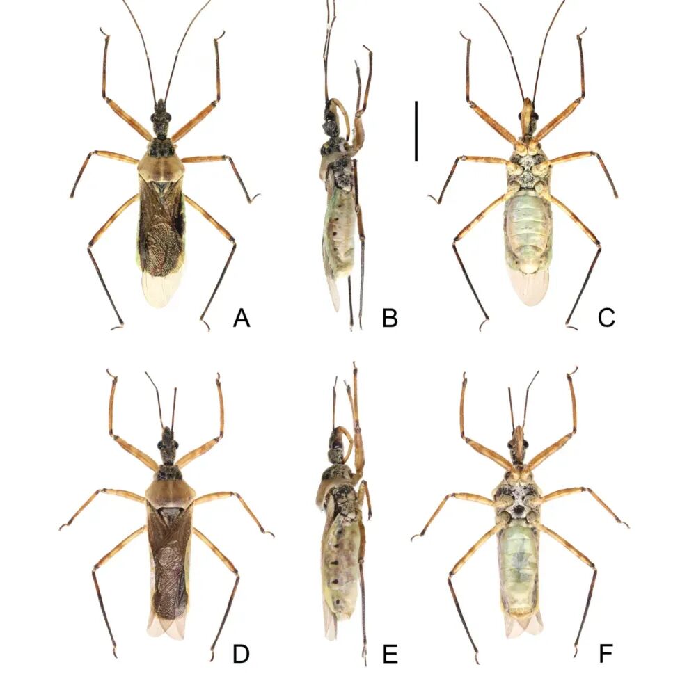 图为吉隆猛猎蝽模式标本照片:雄性正模标本(A-C)、雌性副模标本(D-F);正面观(A,D)、侧面观(B,E)、腹面观(C,F)。