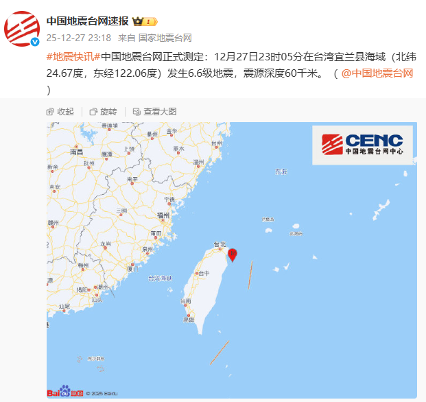 中国地震台网正式测定:12月27日23时05分在台湾宜兰县海域(北纬24.67度,东经122.06度)发生6.6级地震,震源深度60千米。