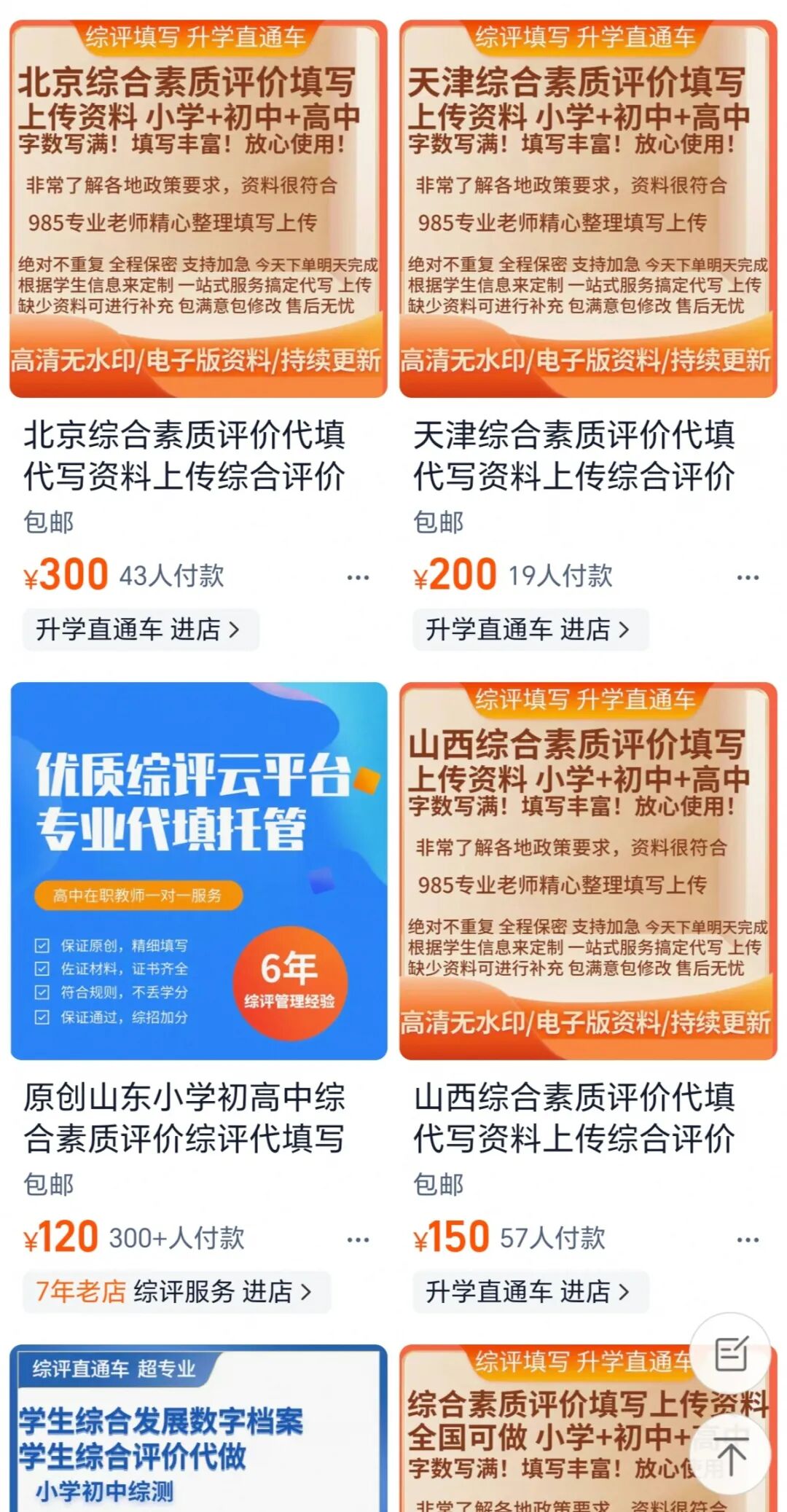于是,我们看到了荒诞的一幕幕:小区花园里的突击跳绳录像、厨房灶台前摆拍的铲锅照片,“综评”填报沦为家长和学生的“表演式打卡”。更令人揪心的是,互联网上明码标价的“综评”代写服务已然形成灰色产业链——“300元包一学期”“原创不重复”“各省通吃”的宣传刺眼夺目,更有一些商家月销量突破500份,将本应记录学生成长的“综评”异化为可交易的“商品”。