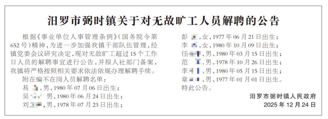 近日,湖南省岳阳市汨罗市弼时镇人民政府发布一则《关于对无故旷工人员解聘的公告》。