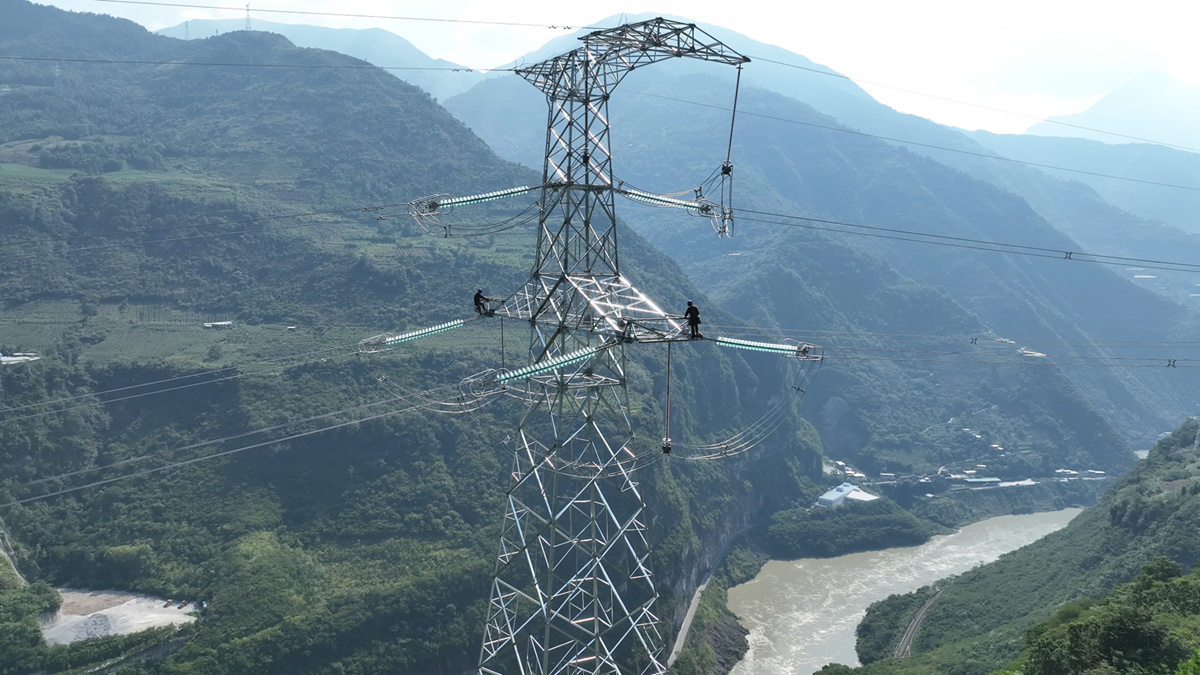 作业人员在乐山枕头坝二级、沙坪一级水电站500千伏送出工程现场开展螺栓紧固作业。(谢春艳 摄)