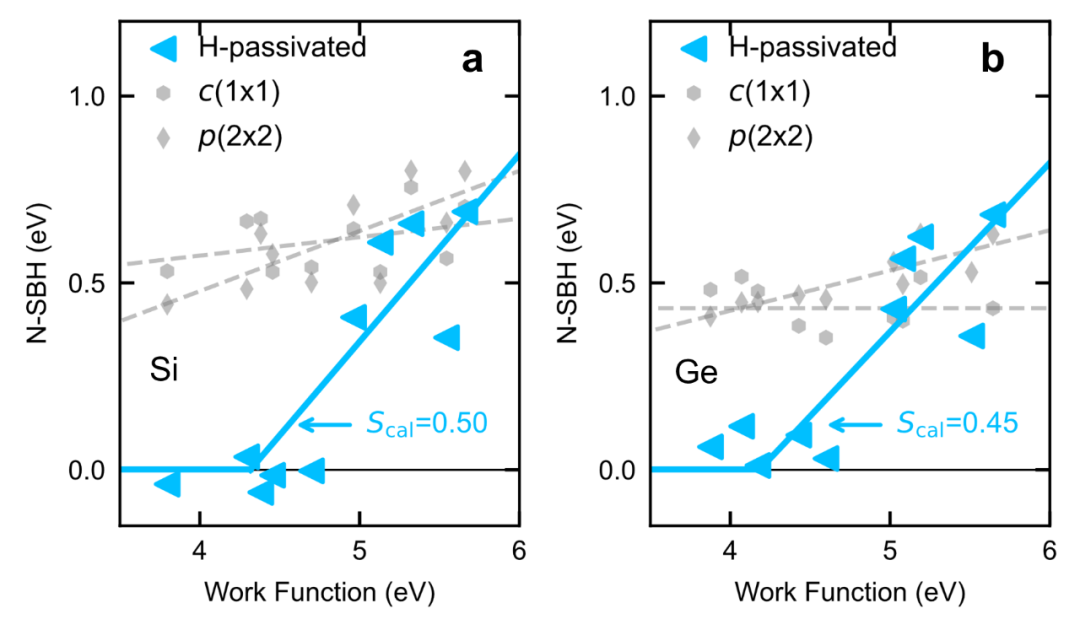 ▲通过使用氢原子完美钝化硅和锗界面悬键,消除所有悬键诱导表面态,从而大幅削弱费米能级钉扎效应
