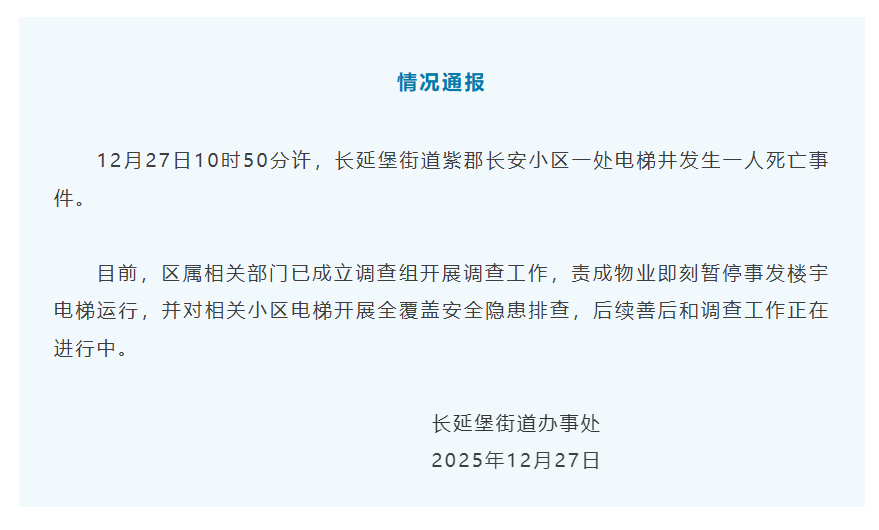 12月27日10时50分许,长延堡街道紫郡长安小区一处电梯井发生一人死亡事件。