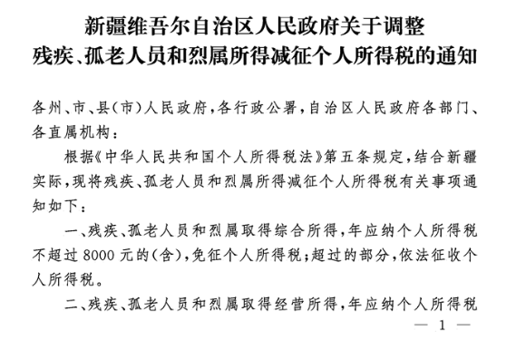 12月26日,自治区人民政府网站发布通知,调整残疾、孤老人员和烈属所得减征个人所得税。通知明确,残疾、孤老人员和烈属取得综合所得或经营所得,年应纳个人所得税不超过8000元的(含),免征个人所得税;超过的部分,依法征收个人所得税。纳税人同时取得综合所得和经营所得,可以选择其中一个所得项目享受减征个人所得税政策,不得重复享受。纳税人同时有残疾、孤老人员和烈属两种以上身份的,可以选择其中一种身份享受减征个人所得税政策,不得重复享受。各级税务、民政、财政、退役军人事务、残联等部门应加强协作配合和信息共享,开展政策解读,确保个人所得税优惠政策落实到位。通知自2026年1月1日起执行。《自治区人民政府关于同意对残疾、孤老人员和烈属减半征收个人所得税的批复》(新政函[1994]132号)同时废止。