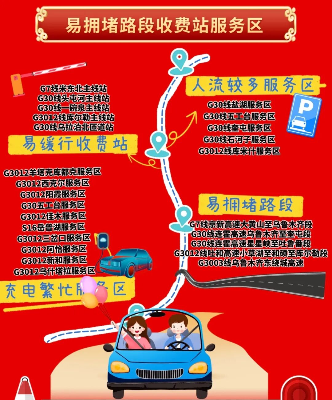 节日期间,易拥堵路段主要为G7线京新高速大黄山至乌鲁木齐段、G30线连霍高速乌鲁木齐至奎屯段、G30线连霍高速星星峡至吐鲁番段、G3012线吐和高速小草湖至和硕至库尔勒段、G3003线乌鲁木齐东绕城高速。