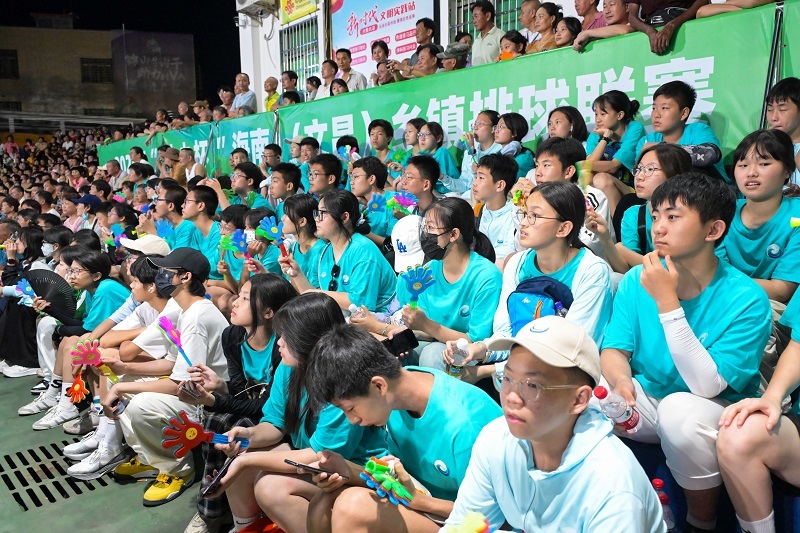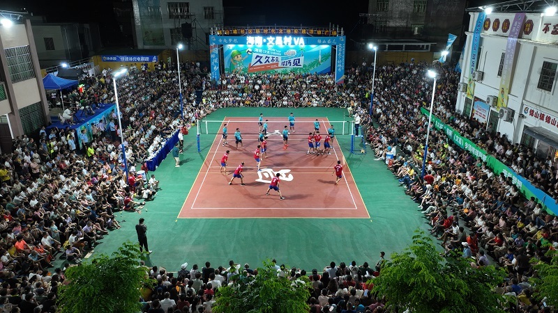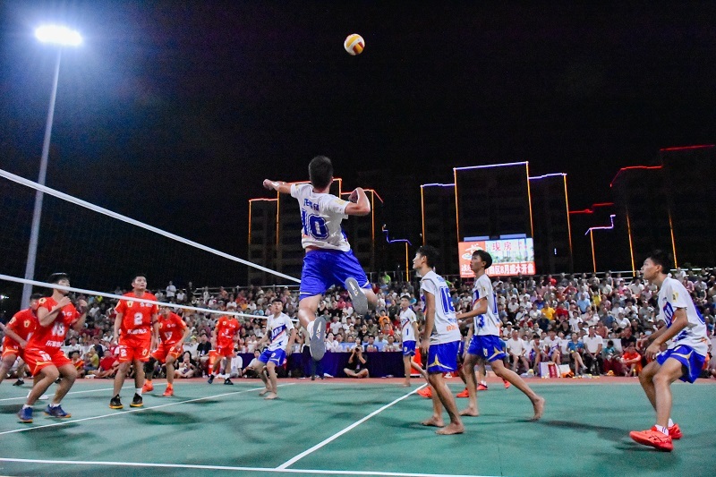 温暖的海风吹拂琼乡,各村镇的排球场被璀璨灯火一一点亮,欢呼声、呐喊声与敲锣打鼓声交织在一起,小将灵活跳跃,老将沉稳传球,村民们围坐四周,文明喝彩。