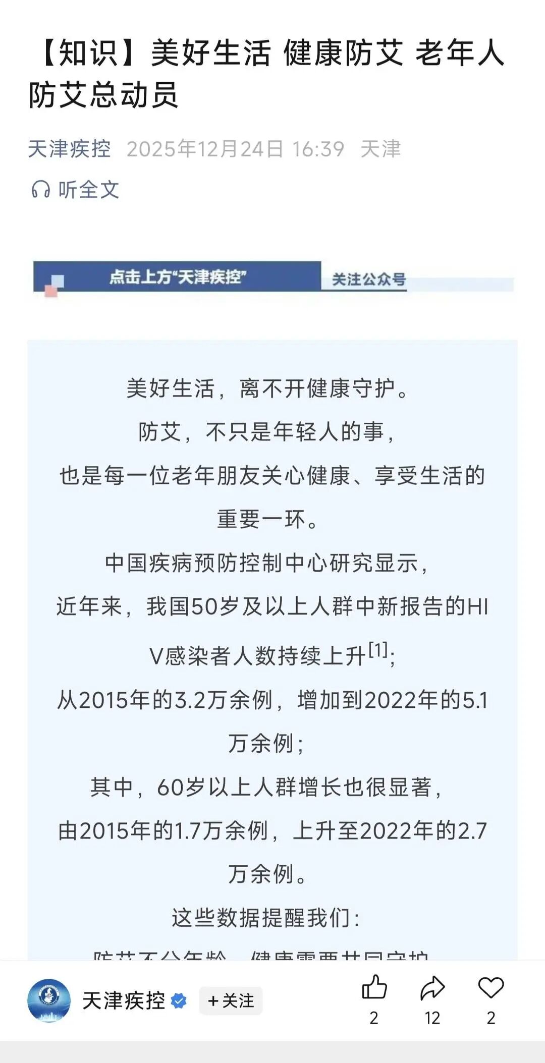 对此,社会层面的关注也正在形成。天津、成都、西安等多地疾控中心主动发布老年HIV防控指南,解读感染成因与预防措施。提醒防艾关键在于科学面对、主动防护;有高危性行为的老年人应主动进行HIV检测,早发现、早治疗。