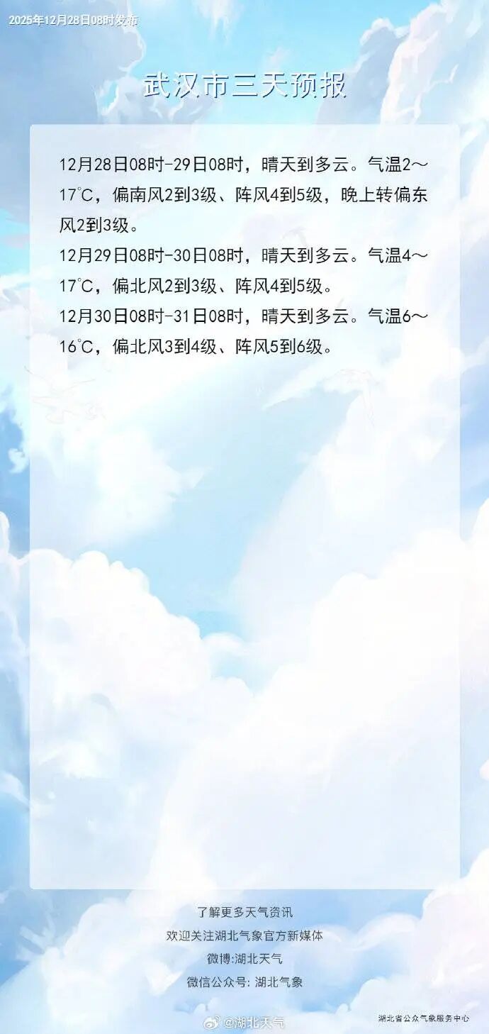 另据武汉气象消息,12月29日至2026年1月2日,武汉有两次冷空气活动,岁末时节北风增强、气温波动较大,其中31日至2026年1月1日,还有一次弱降水过程。