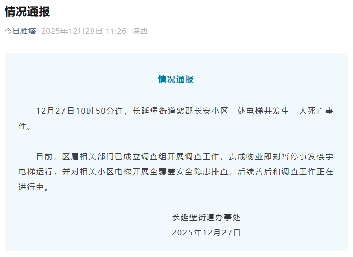 12月27日10时50分许,长延堡街道紫郡长安小区一处电梯井发生一人死亡事件。