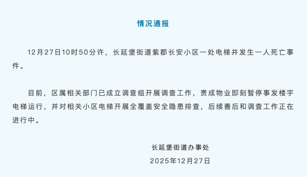 12月27日10时50分许,长延堡街道紫郡长安小区一处电梯井发生一人死亡事件。