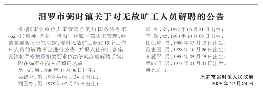 12月24日,湖南省岳阳市汨罗市弼时镇人民政府发布一则《关于对无故旷工人员解聘的公告》。