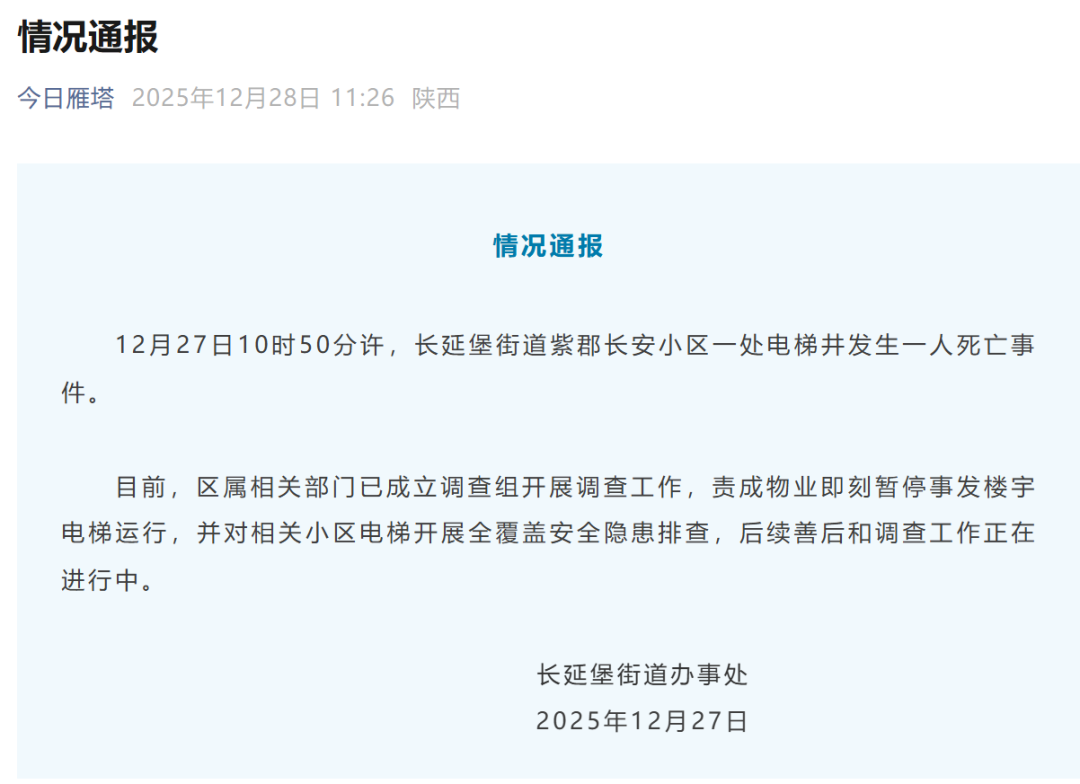 此前据华商报大风新闻,12月27日,陕西省西安市雁塔区紫郡长安小区业主向记者反映,该小区发生电梯事故,疑似有人坠亡。小区业主提供的现场照片显示,有救护车来到现场。
